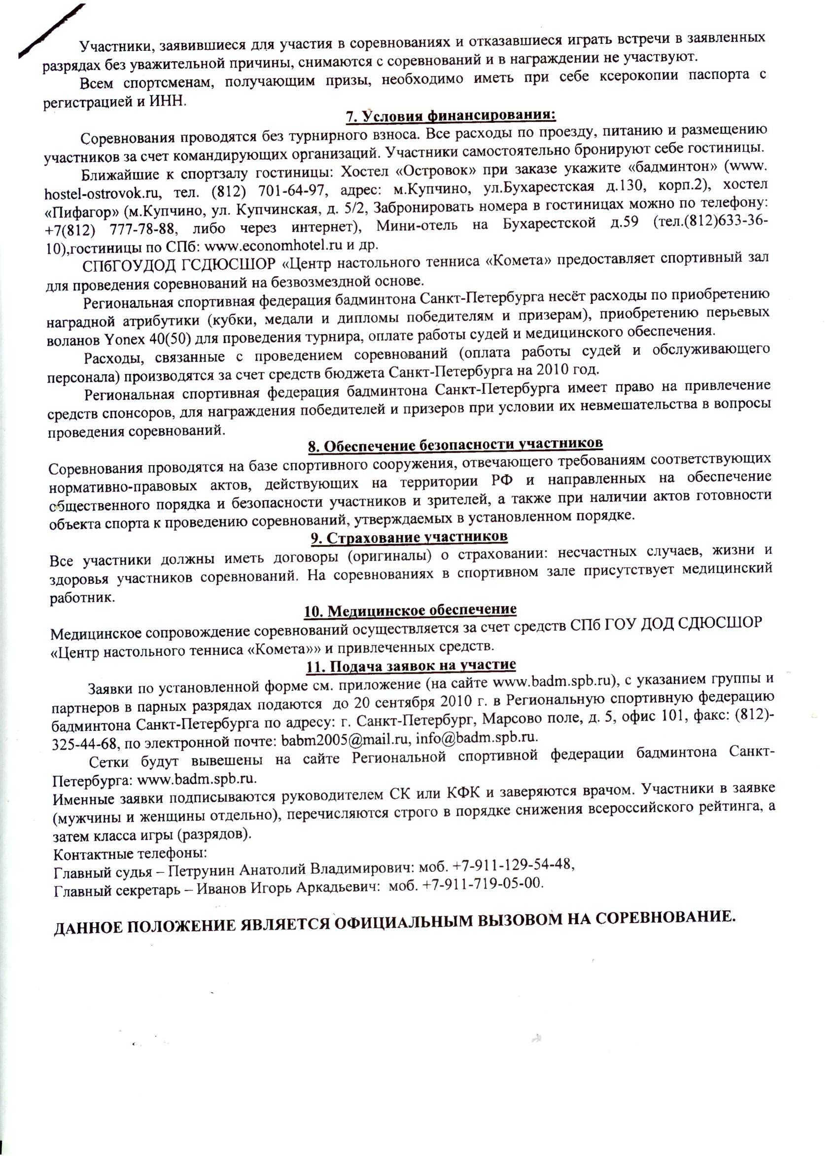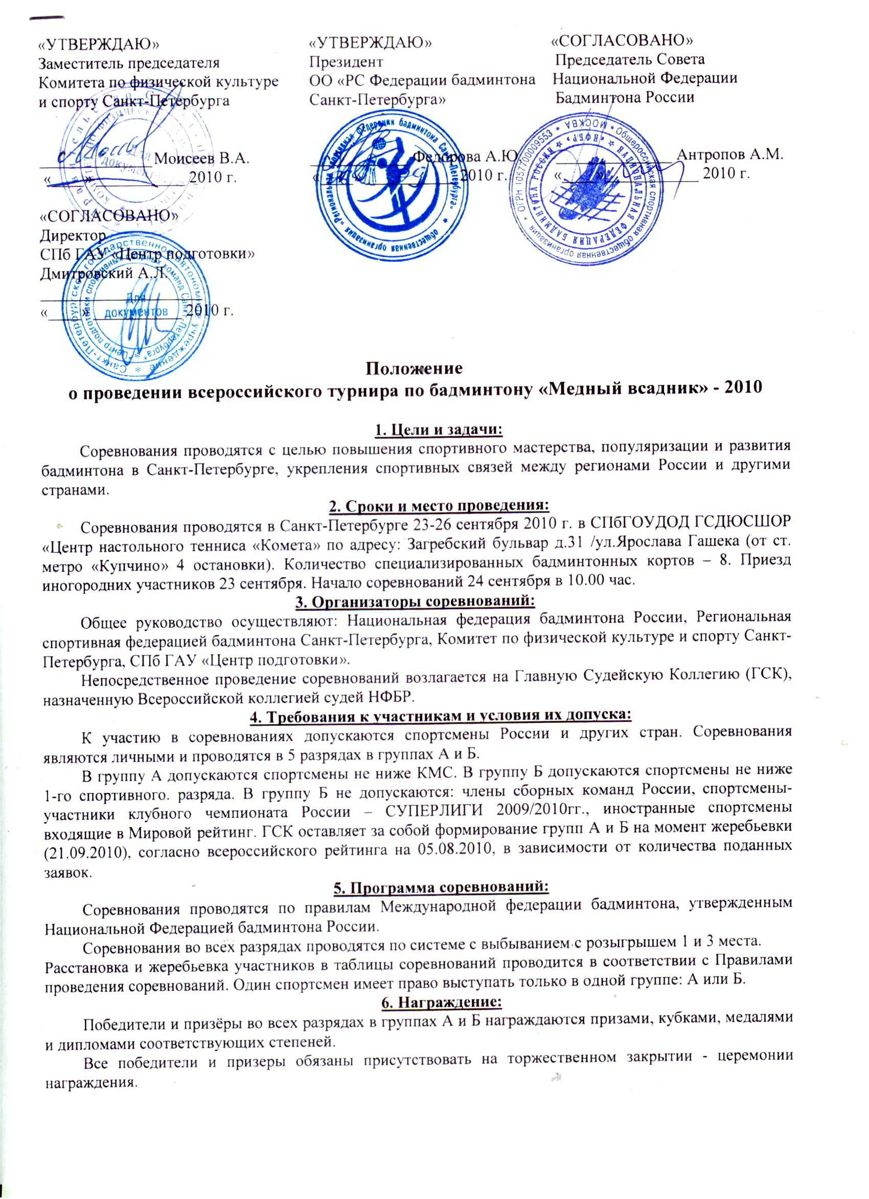 Положение о проведении всероссийского турнира по бадминтону «Медный всадник 2010» (Санкт-Петербург, 23-26 сентября)