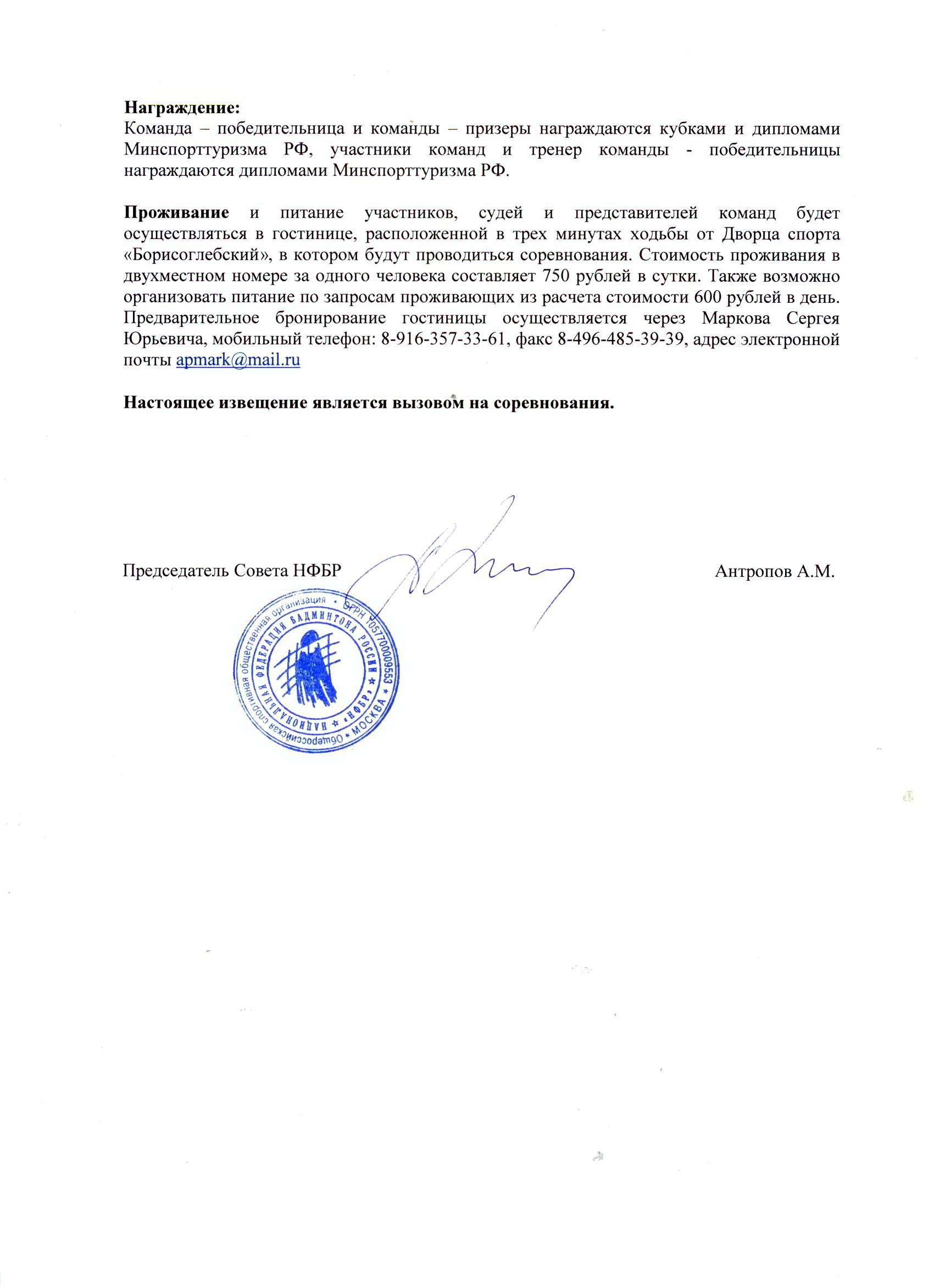 ИЗВЕЩЕНИЕ о проведении чемпионата России по бадминтону среди сборных команд субъектов РФ