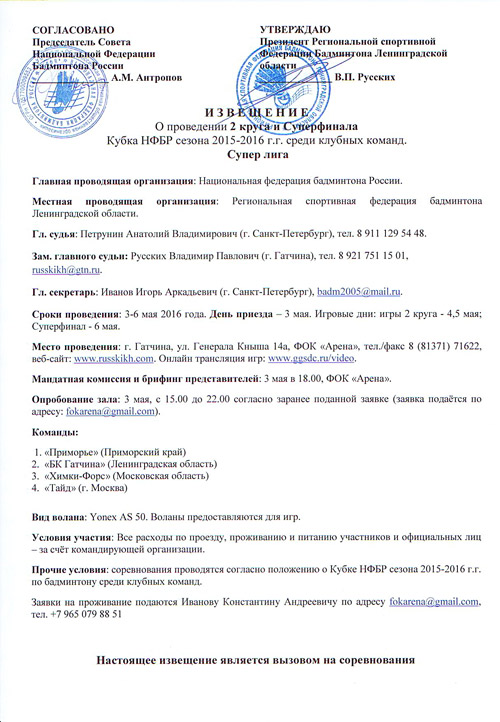 о проведении 2 круга и Суперфинала кубка НФБР среди клубных команд сезона 2015-1016. Суперлига