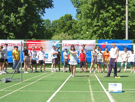 Однако, участие профессиональных бадминтонистов в празднике не ограничилось показательными выступлениями – они были задействованы и в проведении конкурсов. Из достаточно большой программы, намеченной организаторами, удалось реализовать два конкурса: подача и многоволанка.